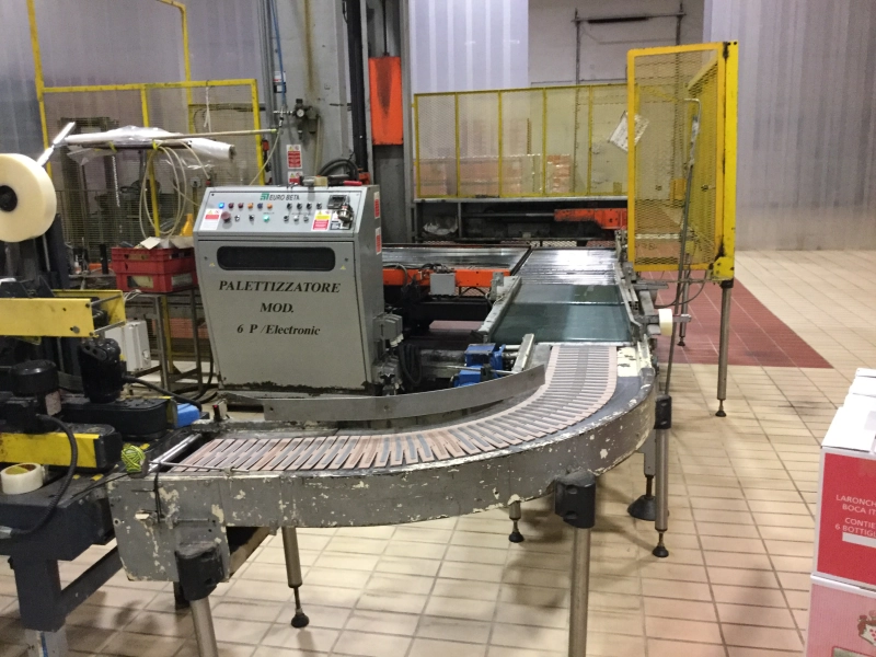 The APSOL CP-G ROBOT automatic palletizer provides a highly efficient solution for handling and palletizing boxes, particularly suited for the sparkling wine industry. This model, used until 2023 in a sparkling wine production line, delivers high performance while maintaining the robustness and safety typical of the APSOL brand.